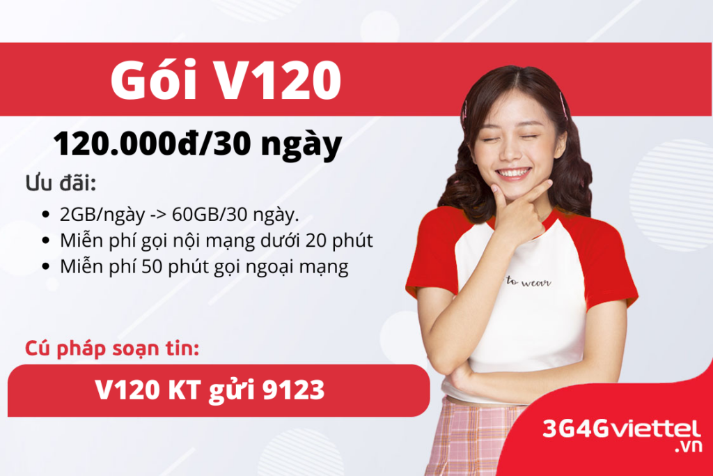 V120C Viettel – 120.000đ là gói cước Combo Data + Thoại mới nhất của Viettel khi đăng ký thành công quý khách sẽ có: 60GB (2GB/ngày) + 20 phút đầu tiên/cuộc gọi nội mạng (tối đa 1000 phút) + 50 phút gọi ngoại mạng . Ưu đãi sử dụng trong 30 ngày. 1. Chi tiết […]